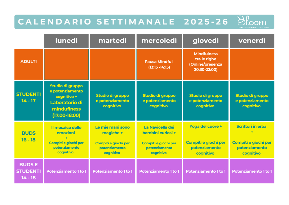 Bloom è un Centro di Pedagogia Moderna che accompagna bambini, ragazzi, famiglie e adulti in un percorso di sviluppo personale e scolastico. Con attività di potenziamento cognitivo, educazione emozionale, metodo di studio e percorsi creativi, aiutiamo ogni bambino a valorizzare i propri talenti e a crescere con consapevolezza e serenità.